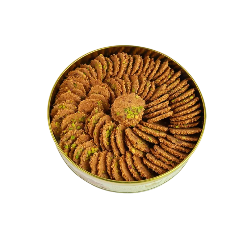 Barazek ist ein traditionelles syrisches Sesamgebäck, sehr knusprig, aromatisch und lecker. Diese Kekse bestehen aus einem feinen Teig, der mit geröstetem Sesam überzogen ist und mit Pistazienscheiben veredelt wird – ein echter Genuss zu Kaffee oder Tee.