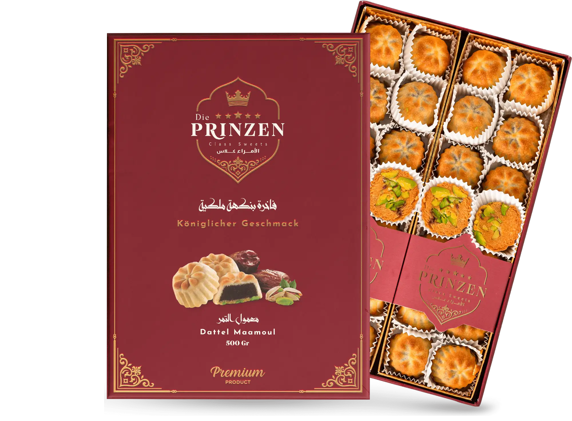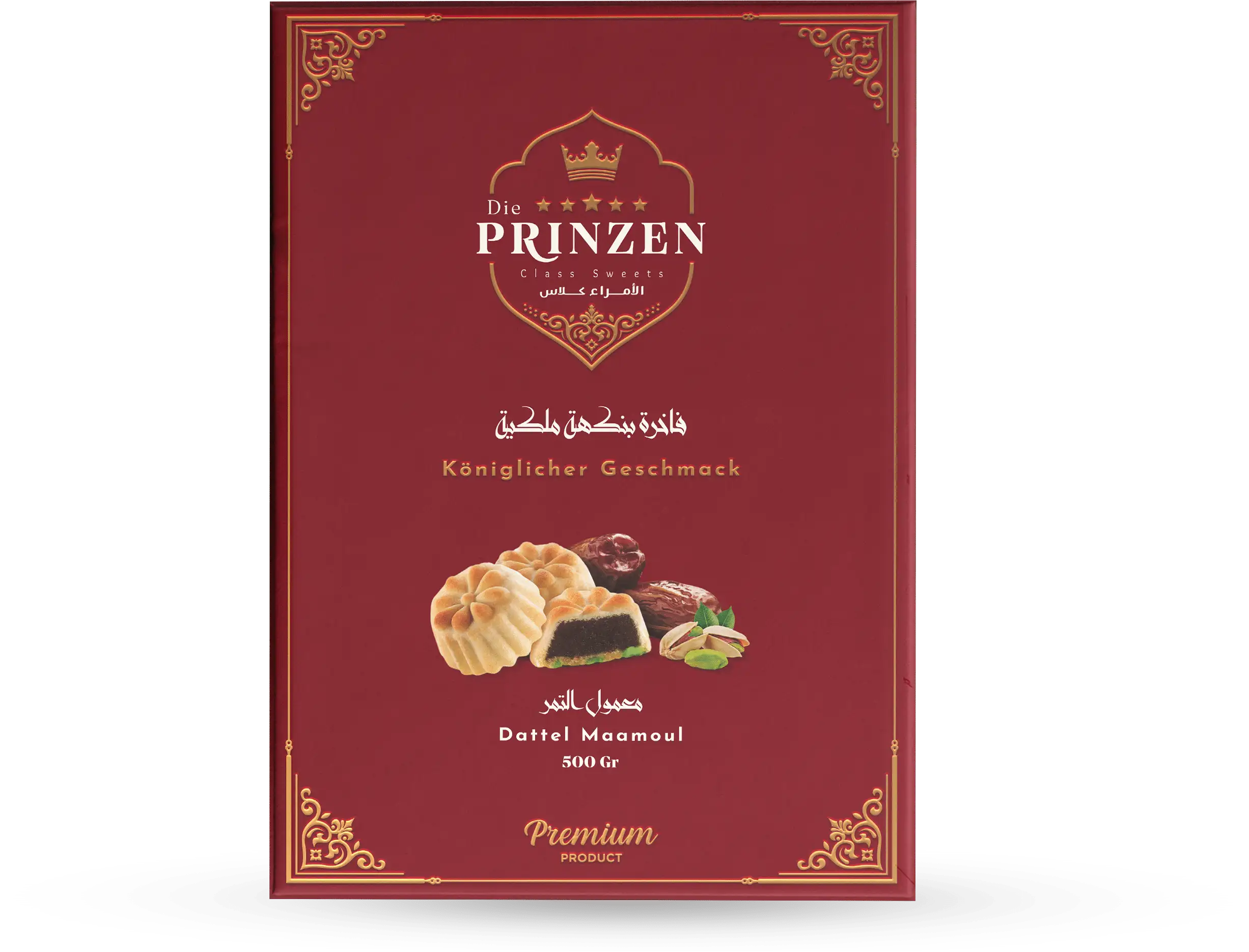 Maamoul Dattel: Ein zartes orientalisches Gebäck, gefüllt mit 60 % Pistazien. Der feine Teig aus Weizenmehl und Ghee macht dieses Maamoul besonders weich und aromatisch – perfekt für festliche Anlässe oder zum Genießen mit Tee oder Kaffee.